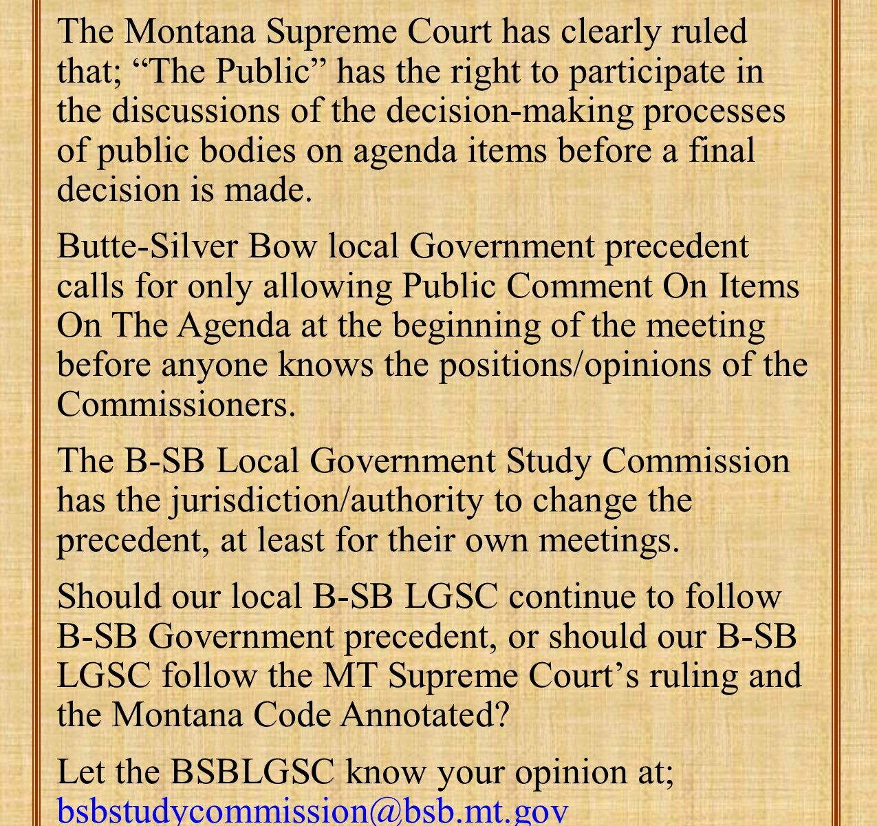 Let the BSBLGSC know your opinion at;  bsbstudycommission@bsb.mt.gov